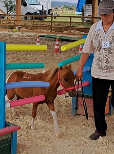 Ogoshi est un yearling de petite taille, pie tobiano alezan.